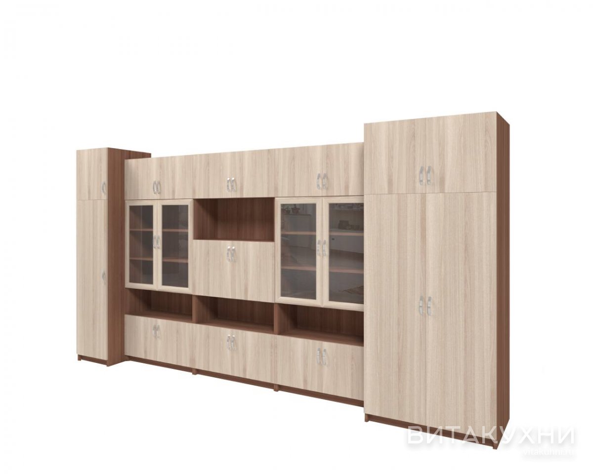 Стенка для гостиной Русь 78 ЛДСП - это прекрасное решение для тех, кто ищет стильную и функциональную мебель для гостиной комнаты. Стенка выполнена из прочного ЛДСП, что делает ее долговечной и устойчивой к повреждениям. Эта большая стенка оснащена шкафами со стеклянными дверцами, которые обеспечат надежное хранение ваших вещей и аксессуаров. Прозрачное стекло позволяет продемонстрировать вашу коллекцию или дорогие сердцу предметы, делая их доступными для глаз. Стенка также оснащена открытыми полками, шкафами, антресолями. Приобрести Стенку для гостиной Русь 78 ЛДСП приглашаем в наш интернет-магазин.