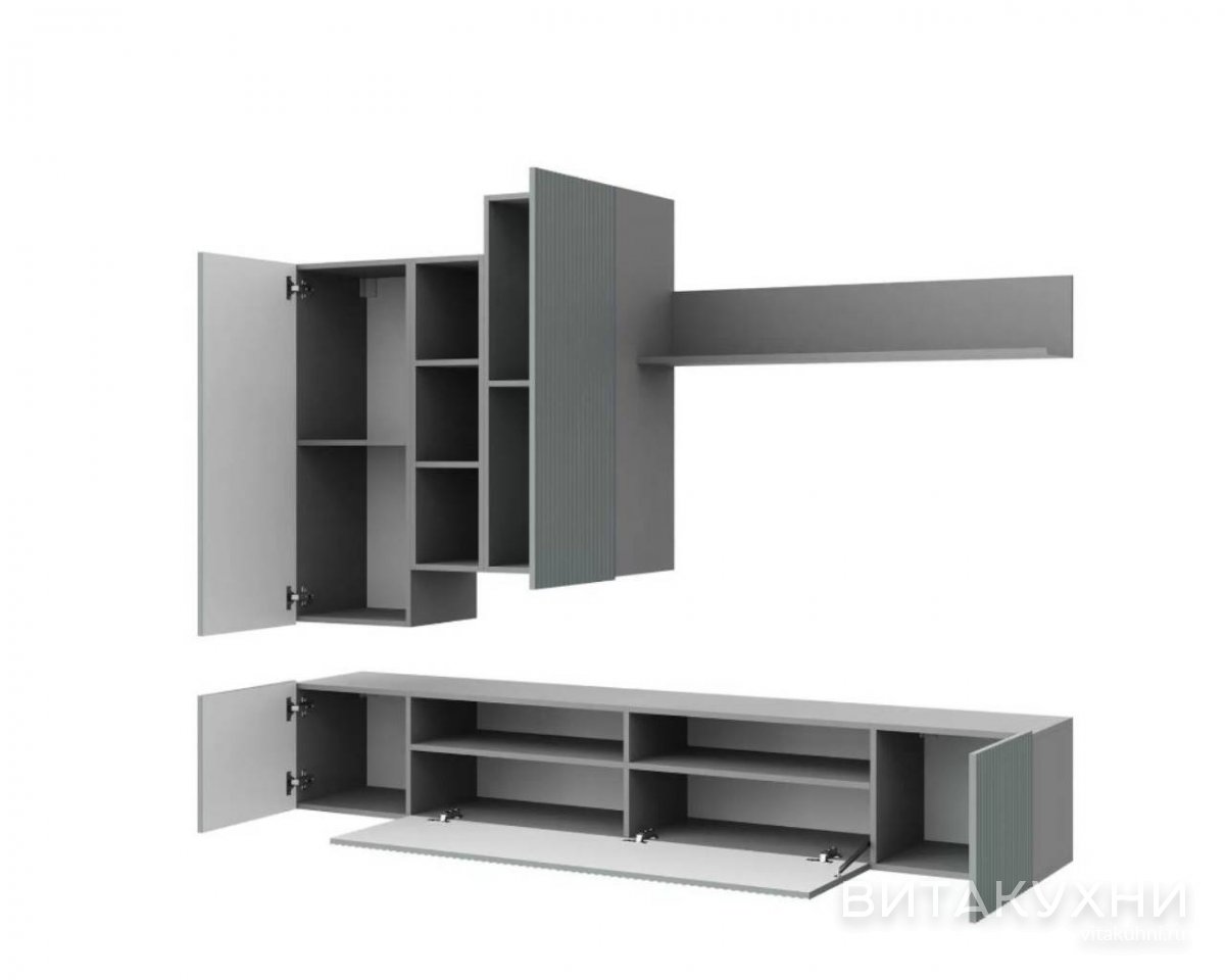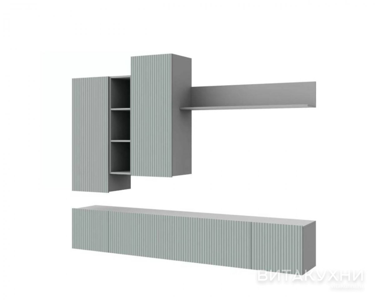 Стенка для гостиной Сканди 2 - это современная и стильная мебель, которая подойдет для любого интерьера. Тумба идеально подойдет для размещения телевизора и сопутствующих аксессуаров, таких как приставка, колонка или игровая консоль. Открытая полка над тумбой станет отличным местом для хранения фотографий, книг или других предметов декора. Два подвесных элемента, один из которых с открытыми полками позволят разместить различные мелочи, такие как статуэтки, вазы или комнатные растения. Благодаря светло-зеленому оттенку и фрезеровке, стенка выглядит легкой и воздушной, добавляя свежести и уюта вашему дому. Купить Стенку для гостиной Сканди 2 приглашаем в наш интернет-магазин.
